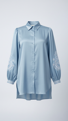 Fraîche et lumineuse, cette chemise en satin de Tencel séduit par son bleu azur délicat et ses manches bouffantes rehaussées de broderies blanches raffinées. Alliant confort et élégance, sa coupe fluide et légèrement oversize avec fentes latérales en fait une pièce idéale pour des looks modernes et féminins, du quotidien aux occasions habillées.