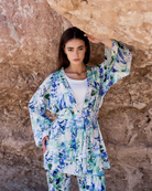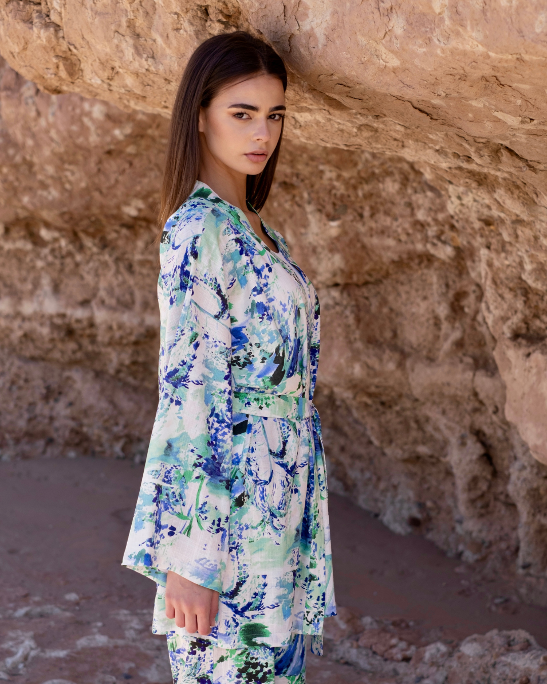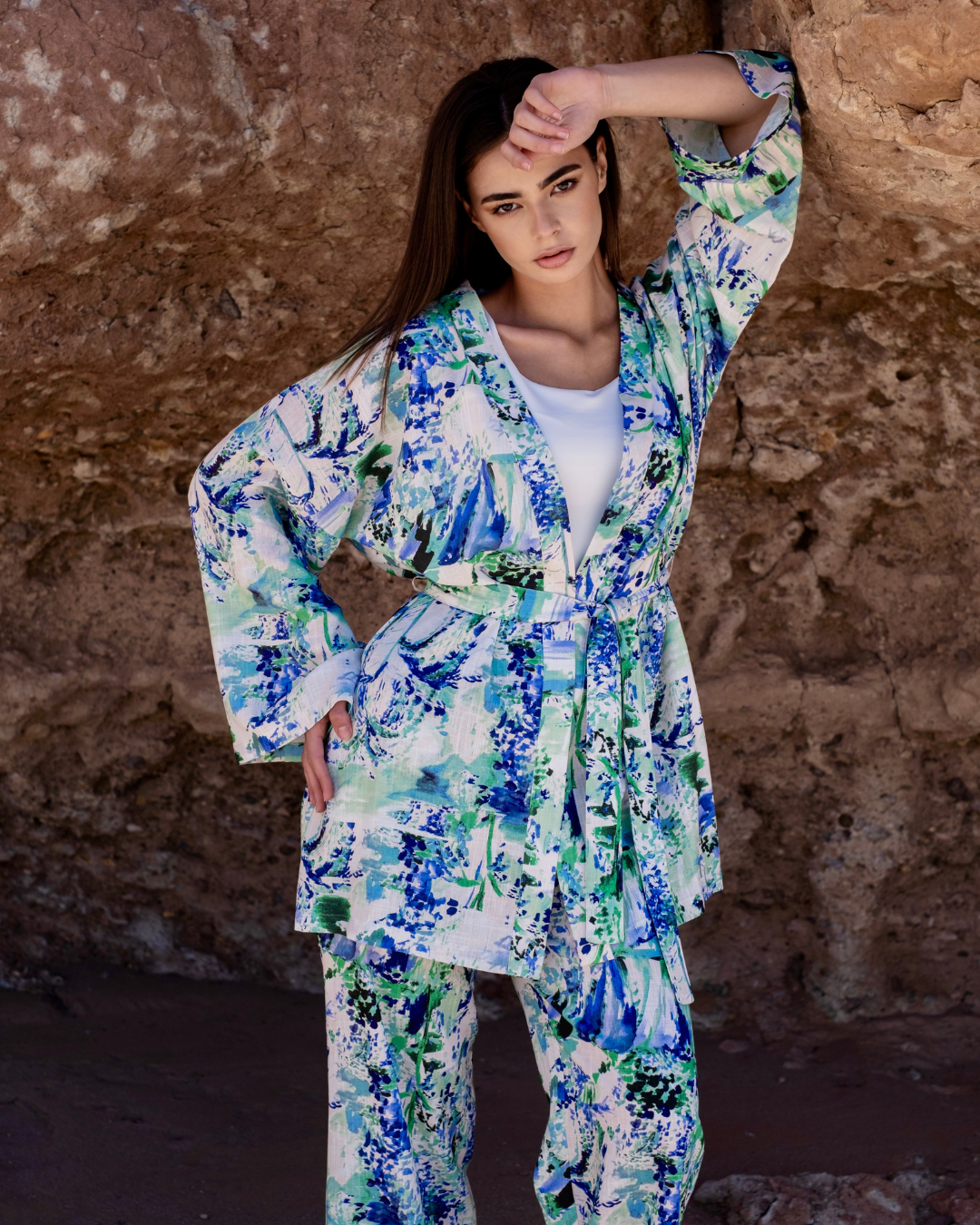 • Une veste kimono à manches longues, légèrement oversize, ceinturée à la taille