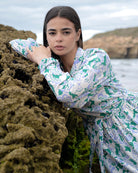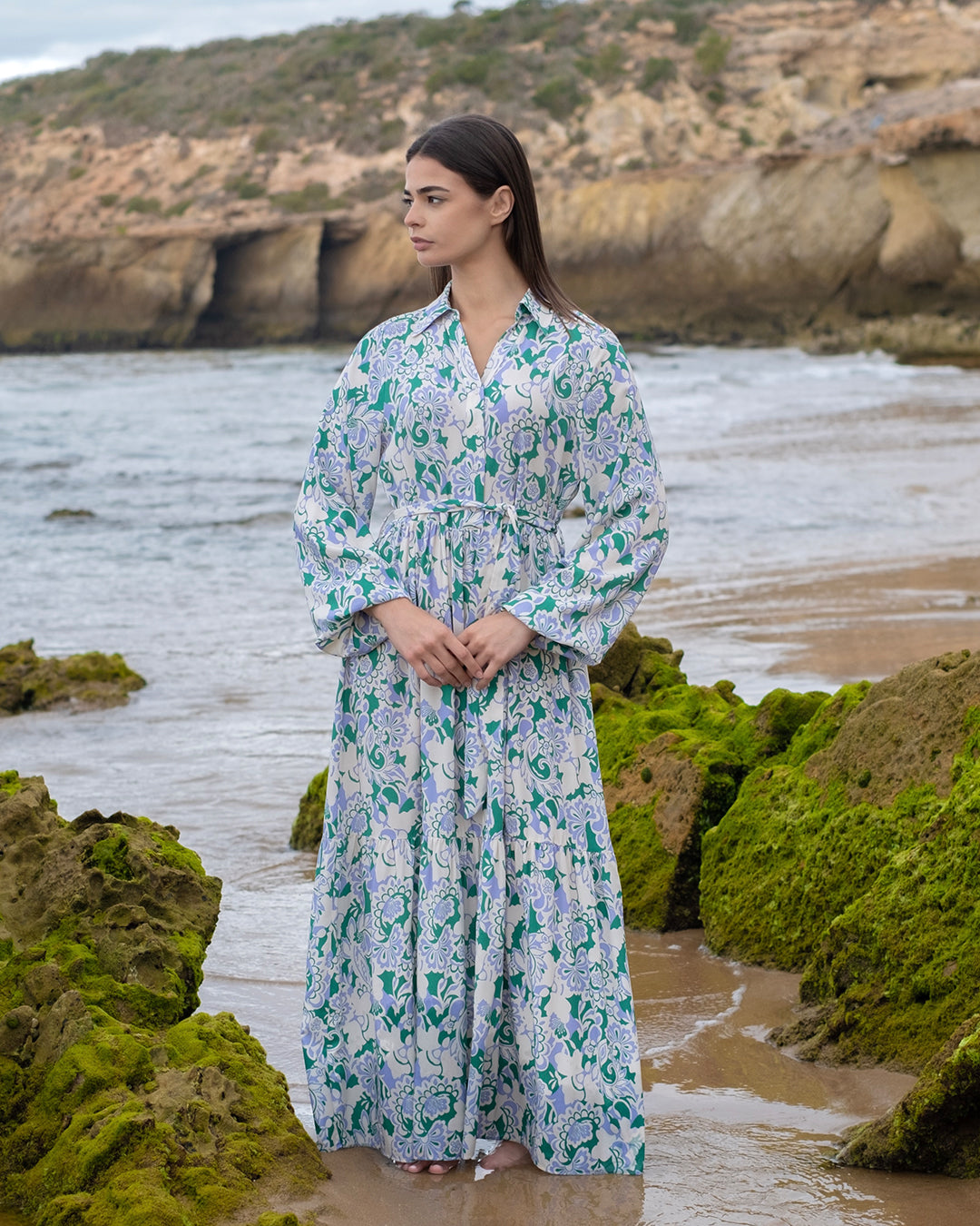 ROBE LONGUE FLEURIE CEINTURÉE À MANCHES BOUFFANTES